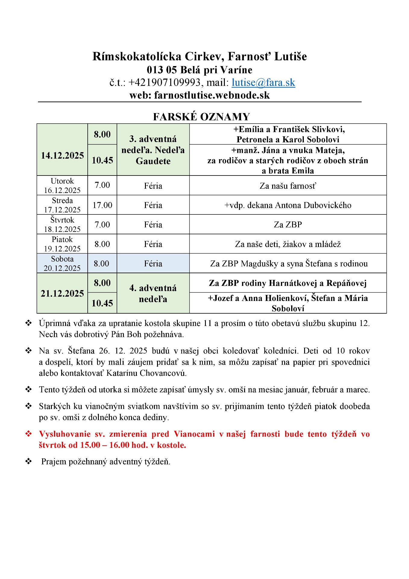 Milí bratia a sestry, srdečne vás pozývame ku sviatosti zmierenia, ktorá sa bude u nás vo farnosti vysluhovať vo štvrtok 18. 12. od 15:00 do 16:00 hod. vo farskom kostole.